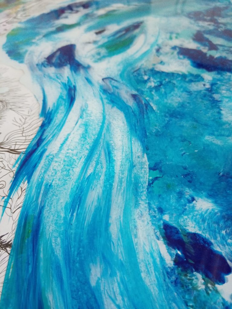 Ich male mit Ozeanwasser aus einer Bucht, sodass ein Teil des Meeres in dein Bild einfließt.